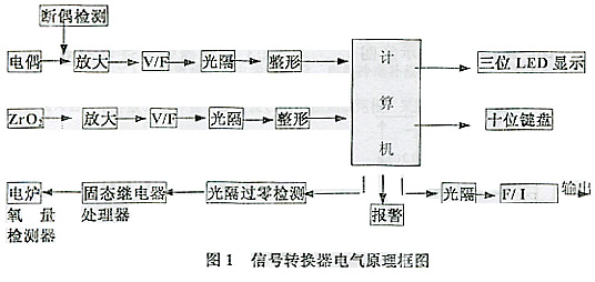 | 式中:E-濃差電池輸出,mV; n-電子轉移數,在此為4; R-理想氣體常數,9.314 W*S/mol; F-法拉第常數,96500 C; T-絕對溫度,K; P"Q-高濃度側氧分壓; P’Q-低濃度側氧分壓。 當電池工作溫度固定于700℃時,上式為: ![]() 由上式可知,在溫度700℃時,當固體電介質一側氧分壓為空氣(20.6%)時,由濃差電池輸出電動勢E,就可以計算出固體電介質一側氧分壓,這就是氧化鋯氧量自動分析儀的測氧原理。 2.主要技術參數 2.1 測量范圍 顯示:0~25.0%?:(三位數字顯示) 模擬量輸出(線性):0~5.00%?,0~10.0%?,0~25.0%? 2.2 測量精度:3% 2.3 響應時間:≤5S(90%測量值) 2.4 溫度精度:700±1℃ 2.5 顯示內容:氧濃()、氧勢(mV)、爐溫(℃)、加熱電壓(V)、量程上、下限()、報警上、下限() 2.6 鍵盤設定:報警上、下限設定,探頭零電勢校正 2.7 自診斷內容及故障類別符號: E-0 氧量上限 E-1 氧量下限 E-2 溫度異常(高) E-3 溫度異常(低) E-4 溫度異常(快) E-5 溫度異常(停) E-6 氧勢異常 E-7 斷偶 2.8 輸出:0-10mA 或 4-20mA 2.9 負載電阻:0-1.6kΩ(0-10mA輸出),0-800Ω(4-20mA輸出) 2.10 檢測器長度為0.2m、0.4m、0.8m、1.0m、1.2m。 3 使用條件 3.1 信號轉換器的使用條件 3.1.1 儀器安裝環境應無易燃、易爆和強腐蝕性氣體,并要求通風良好。 3.1.2 工作環境溫度:0-50℃ 3.1.3 工作環境溫度:≤90% 3.1.4 供電電壓:220V.AC±10%Hz 3.1.5 功率消耗:150W 3.2 氧量檢測器的現場按裝條件 檢測器的現場按裝場所必須滿足下列條件: 3.2.1 避開震動場合; 3.2.2 要有足夠的工作空間。 3.2.3 煙氣溫度和壓力要在儀器規定范圍內。(煙氣溫度<650℃) 4 儀器的組成 整套儀器由氧量檢測器、信號轉換器及有關附件組成。 4.1 氧量檢測器 氧量檢測器由防塵裝置、氧化鋯管、加熱電爐、測溫熱電偶、接線盒以及殼體等主要部件組成。整個裝置采用全封閉型結構,以增加整個裝置的密封性能,提高使用壽命。 氧化鋯管是該檢測器的核心,由它產生氧濃差電勢信號,使用時應注意避免劇烈震動,以免損壞。 檢測器內加熱電爐的作用是提供氧化鋯元件正常工作所需的溫度,為延長加熱電爐的壽命,在工藝上做了特殊的處理。由于檢測器本身帶有加熱裝置,因而在低于600℃的環境中仍能正常工作。 4.2 信號轉換器 微機化氧量自動分析儀的信號轉換器實際上是一個小型的測控系統,由單片機作為中央控制系統。 將來自氧量檢測器的模擬信號(氧勢、熱電勢)分別調制成0-10KNz調頻信號,經光電隔離后送至計算機,采用調頻方式能將儀表輸入、輸出相互隔離,這樣就消除了諸如大電流跳變所引起的干擾,能夠克服高共模電壓,因而大大提高了儀表的抗干擾能力。應用程序主要由主程序和子程序組成,所有的程序都采用模塊結構編制,便于修改、增加軟件功能,以滿足不同用戶的特殊需要。程序運算采用了三位浮點數,保證了運算勞動精度,對氧濃、爐溫的計算,采用查表線性插值法,對爐溫的控制采用增量式PID算式控制。信號轉換器的電氣原理框圖見圖1