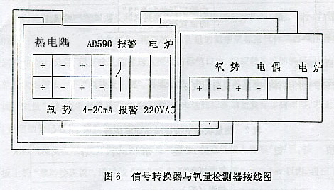 注意:由于探頭的參比氣是靠空氣自然對流提供的,探頭必須水平安裝,參比氣和標準氣接口相應朝下。探頭端部防護套管的缺口位置(可調整方向)也應垂直向下,以防積灰。 5.3 信號轉換器的安裝 信號轉換器的外形尺寸:水平×垂直×深 160×80×250mm 信號轉換器的開口尺寸:水平×垂直 152-1×76-1mm 信號轉換器用隨機配備的安裝夾板及螺絲安裝在儀表盤上,亦可安裝在現場儀表保護箱內。 5.3.1 信號轉換器與檢測器之間的連接 信號轉換器盤裝于控制室,氧量檢測器安裝于現場,它們之間連接線有:氧勢信號線兩根采用RVVP2×1.5帶屏蔽二芯電纜線敷設、電偶冷端補償導線兩根,采用K分度KX-G型2×1.5帶屏蔽二芯補償導線敷設、電爐加熱線兩根,采用RVVP2×2.5二芯電纜線敷設。 信號轉換器與氧量檢測器之間的接線見圖3。